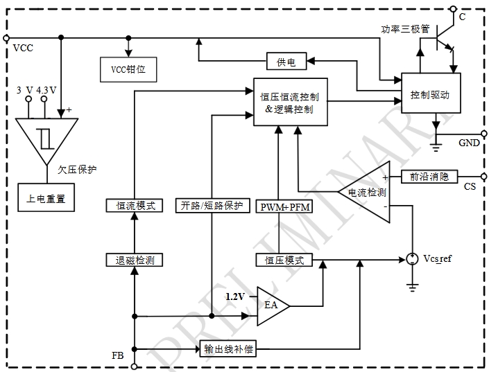芯片逐周期檢測電感的峰值電流,CS端連接到內部的峰值電流比較器的輸入端,與內部閾值電壓進行比較,當CS外部電壓達到內部檢測閾值時,功率管關斷。