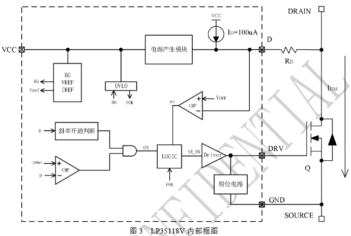 LP35118V的DRV引腳與同步整流MOSFET的柵極連接,通過檢測漏極電壓的變化來控制MOSFET的導通和關(guān)斷。
