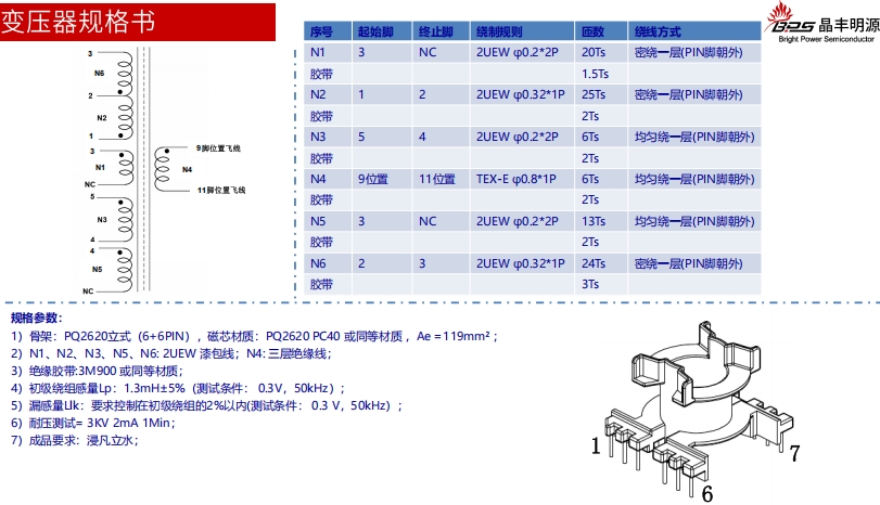 初級繞組感量Lp:1.3mH ±5%(測試條件:0.3V,50kHz)