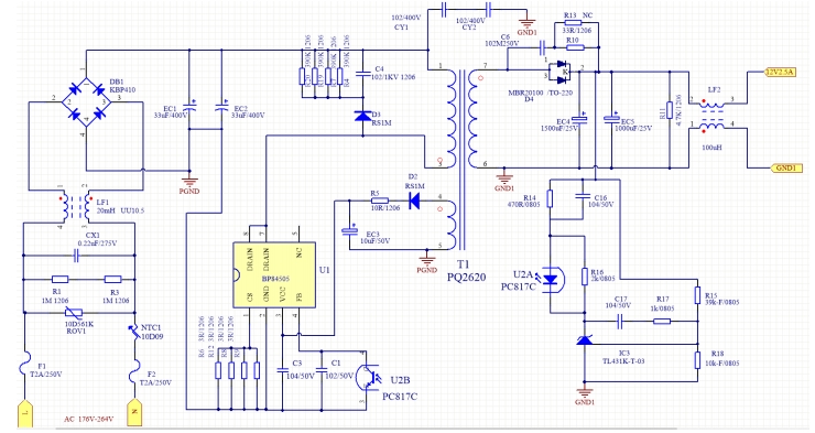 主控芯片:U1(BP84505BP)是核心控制芯片,負責PWM控制和保護功能。