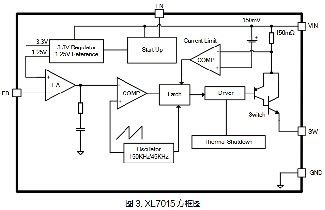 XL7015是一款高效、高壓降壓型DC-DC轉(zhuǎn)換器,固定150KHz開關(guān)頻率,可提供最高0.8A輸出電流能力,低紋波,出色的線性調(diào)整率與負(fù)載調(diào)整率。XL7015內(nèi)置固定頻率振蕩器與頻率補(bǔ)償電路,簡(jiǎn)化了電路設(shè)計(jì)。PWM 控制環(huán)路可以調(diào)節(jié)占空比從0~90%之間線性變化。內(nèi)置輸出過電流保護(hù)功能,當(dāng)輸出短路時(shí),開關(guān)頻率從150KHz降至45KHz。內(nèi)部補(bǔ)償模塊可以減少外圍元器件數(shù)量。內(nèi)部框架圖如下~