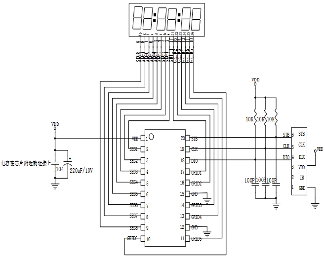 GRID1至GRID6引腳連接到LED顯示屏的位驅動端,用于控制顯示屏的位顯示。