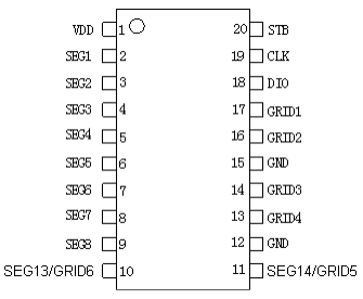 AIP1620芯片采用SOP20封裝,具有20個引腳,每個引腳都有明確的功能定義。例如,VDD引腳為邏輯電源輸入,SEG1至SEG8為段輸出引腳,GRID1至GRID6為位輸出引腳,DIO引腳用于串行數據輸入/輸出,CLK引腳為時鐘輸入,STB引腳用于片選和初始化。這些引腳的合理布局和功能設計,使得AIP1620能夠與外部電路無縫連接,實現高效的信號傳輸和控制。