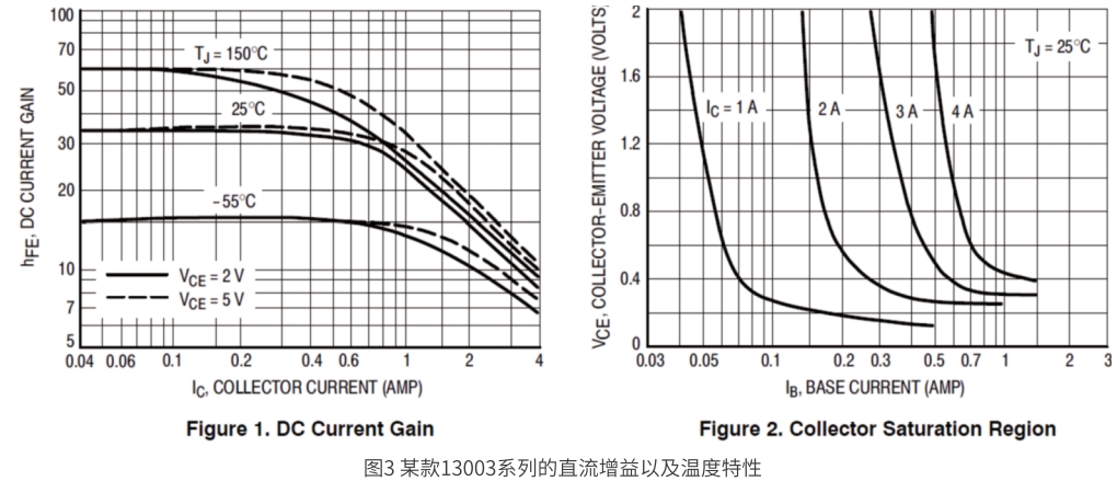 3.功率BJT的hFE是正溫特性,當IC=0.7A左右的時候,高溫時會增加25%左右(如圖3所示),因此,溫度越高,同等驅(qū)動電流(芯片驅(qū)動電流接近零溫)情況下的VCE會越低,導通損耗越小。
