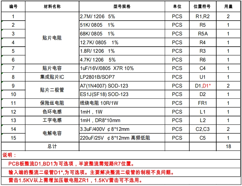 BOM表(物料清單)是實現(xiàn)LP2801B 12V150mA Buck設(shè)計的關(guān)鍵文件,它詳細列出了電路中所需的所有元件及其規(guī)格。以下是該設(shè)計的BOM表內(nèi)容: