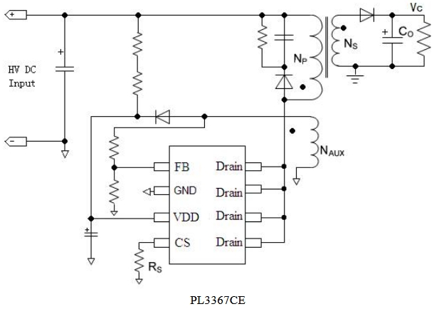 PL3367CE為小功率充電器/適配器應用提供了高效的解決方案,其新穎的恒流/恒壓控制使得系統(tǒng)不需要次級反饋電路,并能實現(xiàn)高精度的恒流/恒壓輸出,從而滿足更嚴格的能源損耗要求。