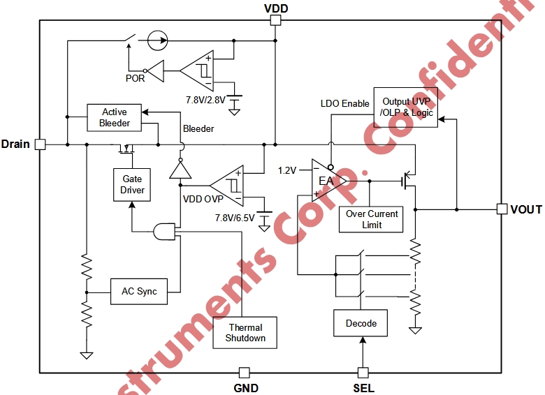 5,6,7,8Drain內部功率MOSFET漏極引腳。在電壓處于充電窗口內時提供能量。