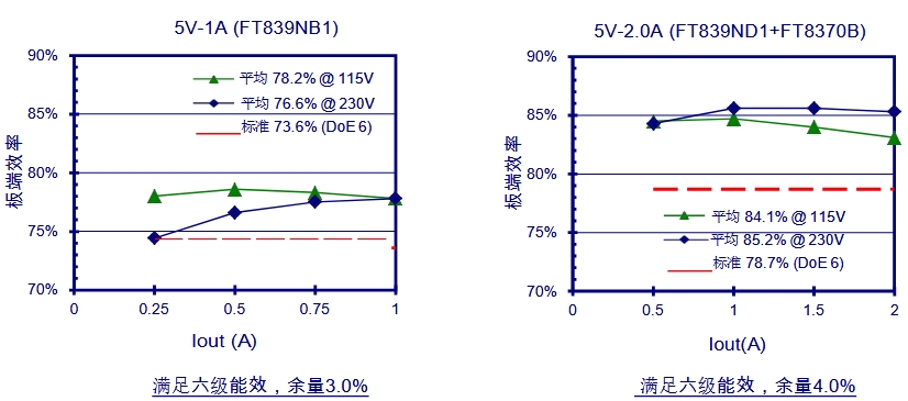 FT839xx/FT8393xx系列芯片在設(shè)計上充分考慮了能效優(yōu)化,能夠輕松滿足DoE和CoC六級能效標(biāo)準(zhǔn)。以FT839NB1為例,在115V和230V輸入電壓下,其平均效率分別達(dá)到了78.2%和76.6%,遠(yuǎn)高于標(biāo)準(zhǔn)要求的73.6%,且余量達(dá)到了3.0%。這意味著在實(shí)際使用中,該芯片不僅能夠高效地將電能轉(zhuǎn)換為設(shè)備所需的能量,還能在不同負(fù)載條件下保持穩(wěn)定的能效表現(xiàn)。