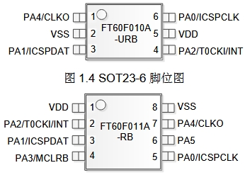 FT60F010A-URT 提供了兩種封裝方式:SOT23-6 和 SOP-8。以下是這兩種封裝方式的腳位圖及其詳細描述: