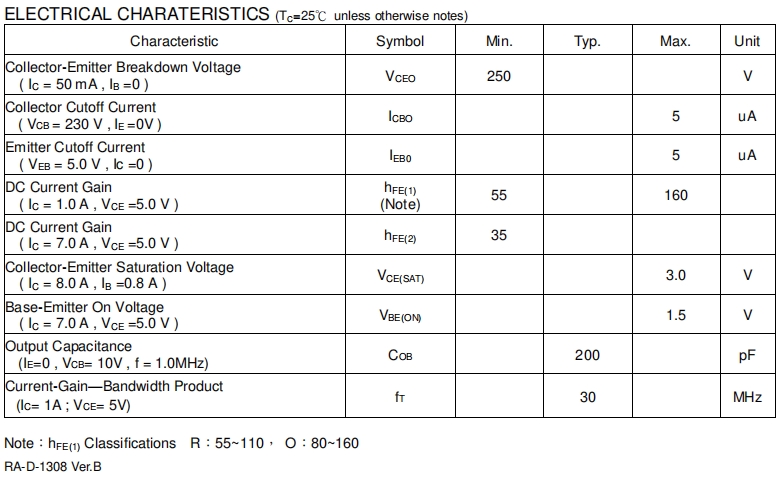 集電極 - 發(fā)射極飽和電壓(VCE(SAT)):在集電極電流為8.0A,基極電流為0.8A時(shí),VCE(SAT)的最大值為3.0V。較低的飽和電壓意味著在晶體管導(dǎo)通時(shí),能量損耗較小,從而提高了功率放大器的效率。