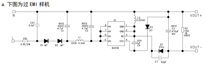 在電路原理圖中,可以看到FT8451B的輸入端通過一個電感L1與高壓輸入相連,電感L1的作用是儲能和濾波,能夠有效平滑輸入電流,減少電流的波動。同時,一個色環(huán)電阻FR1與電感L1串聯(lián),起到限流和保護(hù)的作用,防止輸入電流過大對芯片和電路造成損壞。在輸出端,一個工字型電感L2與芯片相連,其感量為0.22mH,這個電感在電路中起到關(guān)鍵的儲能和電流調(diào)節(jié)作用,確保輸出電流的穩(wěn)定。此外,多個電解電容和陶瓷電容分布在電路中,用于濾波和穩(wěn)定電壓,進(jìn)一步提高電源的輸出質(zhì)量。