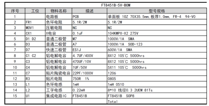 FT8451B的物料清單簡潔明了,主要包括以下幾個關(guān)鍵元件: