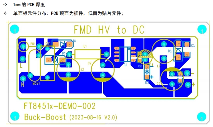 FT8451B的PCB布局設(shè)計同樣精心考慮。采用單面板設(shè)計,元件分布合理,便于生產(chǎn)和維護(hù)。PCB厚度為1mm,尺寸為70mm×33.5mm,這種尺寸設(shè)計既保證了足夠的元件布局空間,又不會使PCB過大,影響設(shè)備的整體體積和便攜性。在元件分布上,PCB頂面主要為插件元件,底面則為貼片元件。這種分布方式充分利用了PCB的空間,提高了空間利用率,同時也便于元件的焊接和安裝。