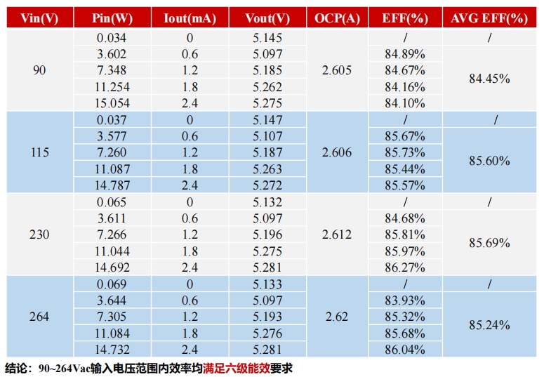 在90Vac至264Vac的輸入電壓范圍內(nèi),S7134B芯片的效率均滿(mǎn)足六級(jí)能效要求。具體數(shù)據(jù)如下表所示: