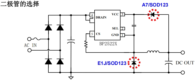 以BP2522D為例,持續輸出240mA,脈沖350mA,電感量為470uH,電感電流紋波為57mA。最大峰值電流為579mA,BP2522D內部MOS管限制最大電流為750mA,留有一定余量,可取Rcs=0.3ohm。