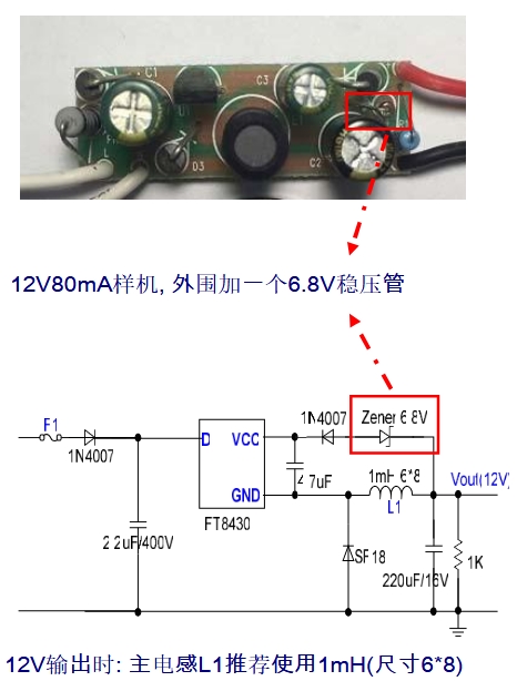 在該電路中,FT8430通過一個470uH的工字電感和一個1uF/400V的電容實現5V-120mA的輸出。該電路具有內置抖頻功能,能夠輕松通過EMI測試,適用于需要高精度電壓和低待機功耗的小家電設備,如智能插座、智能照明設備等。