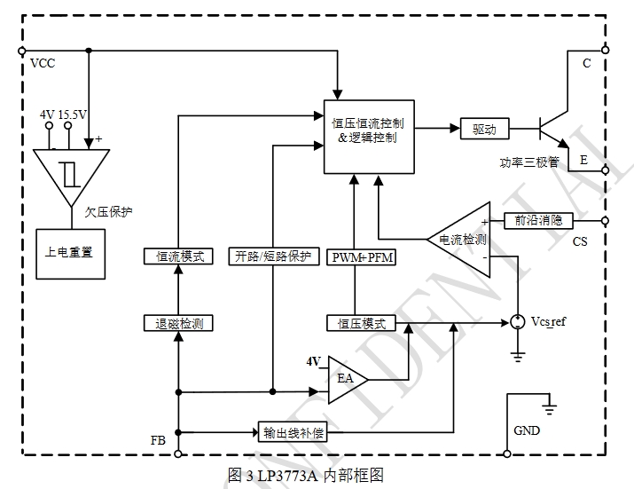 LP3773A采用SO-7封裝,集成高壓啟動、恒壓(CV)控制及過流保護(OCP)功能,支持90-420VAC寬輸入電壓范圍。其關鍵特性包括: