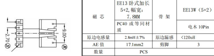 原邊電感量:2.8mH±7%(1kHz測試條件)。