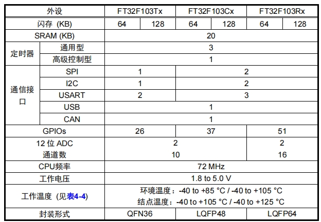 FT32F103x8/B 微控制器集成了高性能的 Arm? Cortex?-M3 32 位 RISC 內(nèi)核,工作頻率為 72 MHz,內(nèi)嵌高速存儲(chǔ)器 (高達(dá) 128 KB 的閃存和 20 KB 的 SRAM),以及大量的增強(qiáng)型 I/O 和連接到兩條 APB總線(xiàn)的外設(shè)。所有器件都提供兩個(gè) 12 位 ADC、三個(gè)通用 16 位定時(shí)器和一個(gè) PWM 定時(shí)器,以及標(biāo)準(zhǔn)和先進(jìn)的通信接口:多達(dá)兩個(gè) I2C、兩個(gè) SPI、 三個(gè) USART、一個(gè) USB 和一個(gè) CAN。