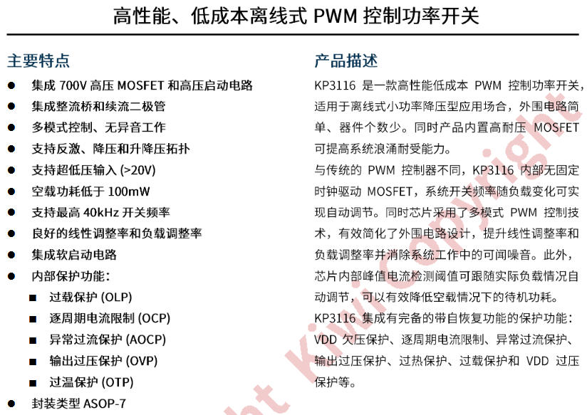 KP3116WPA 把“高壓 MOS + 高壓啟動 + 多模式 PWM”一口氣塞進 SOP-7,外圍僅 8 顆料,空載 <100 mW,系統成本 <0.45 元,PCB 1 cm2 搞定。看完這篇,你會明白什么叫“一粒米”電源。