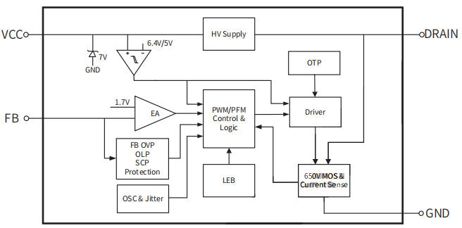 | 內置高壓MOSFET | 650V耐壓,RDS(on)約1.5Ω(典型值) |