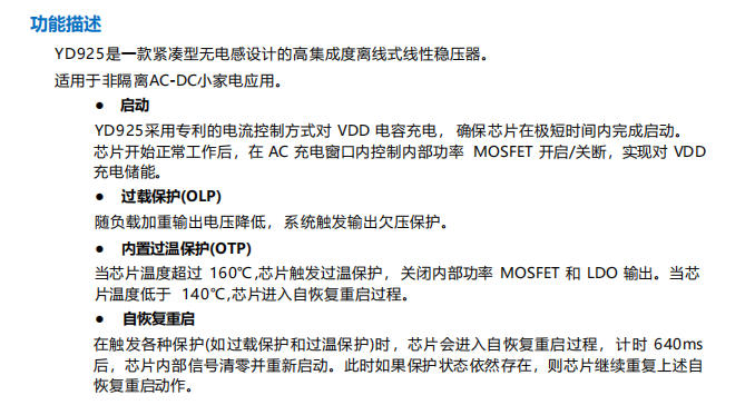 YD925是一款緊湊型離線式線性穩(wěn)壓芯片,采用SOP-8封裝,內(nèi)置650V高壓MOSFET。它最大的特點(diǎn)是無(wú)需電感、無(wú)需高壓電容,直接從220V交流電轉(zhuǎn)換為穩(wěn)定的5V直流輸出,外圍極其簡(jiǎn)單。這款芯片專為替代傳統(tǒng)的阻容降壓方案而設(shè)計(jì),解決了阻容降壓體積大、可靠性差、輸出紋波大等問(wèn)題,同時(shí)成本更低、生產(chǎn)更方便。