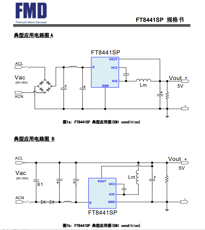 FT8441SP采用極高壓技術(shù),通過內(nèi)置高壓啟動電路、高壓功率MOSFET開關(guān)以及電流采樣電阻,減少了外圍元器件,大大的簡化了系統(tǒng)應用。內(nèi)置的抖頻和軟驅(qū)動技術(shù)有效的提高了EMI性能。