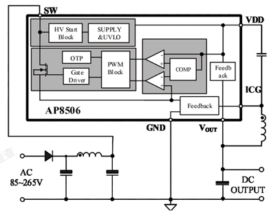 AP8506基于高壓同步整流架構(gòu),集成PFM控制器以及650V高可靠性MOSFET,用于外圍元器件極精簡(jiǎn)的小功率非隔離開(kāi)關(guān)電源。AP8506內(nèi)置730V高壓?jiǎn)?dòng),實(shí)現(xiàn)系統(tǒng)快速啟動(dòng)、超低待機(jī)功能。該芯片提供了完整的智能化保護(hù)功能,包括過(guò)流保護(hù),欠壓保護(hù),過(guò)溫保護(hù)。另外AP8506具有優(yōu)異的EMI特性。