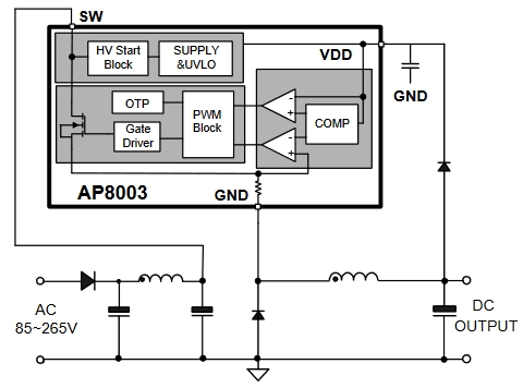 AP8003ZAC-T1集成PFM控制器及500V高可靠性MOSFET,用于外圍元器件極精簡的小功率非隔離開關電源。AP8003內置500V高壓啟動,實現(xiàn)系統(tǒng)快速啟動、超低待機功能。該芯片提供了完整的智能化保護功能,包括過載保護,欠壓保護,過溫保護。另外AP8003具有優(yōu)異的EMI特性: