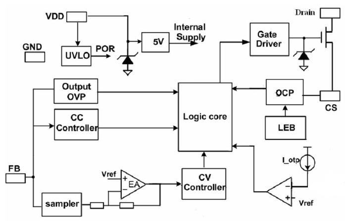 PL3326CE 是一系列高效率、高集成度、原邊調節的 PWM功率開關,其主要應用于小于 15W 的 AC/DC 反激式開關電源。PL3326CE 通過去除光耦以及次級控制電路,簡化了充電器/適配器等傳統的恒流/恒壓的設計,從而實現高精度的電壓和電流調節,內部框架圖如下所示~