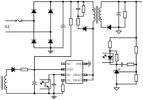 芯片通過對輸出采樣并反饋到光耦獲得高精度的恒壓輸出。內置的斜率補償電路確保了峰值電流模控制的穩定性。內部集成的頻率抖動功能可以改善EMC,降低EMI濾波成本。
