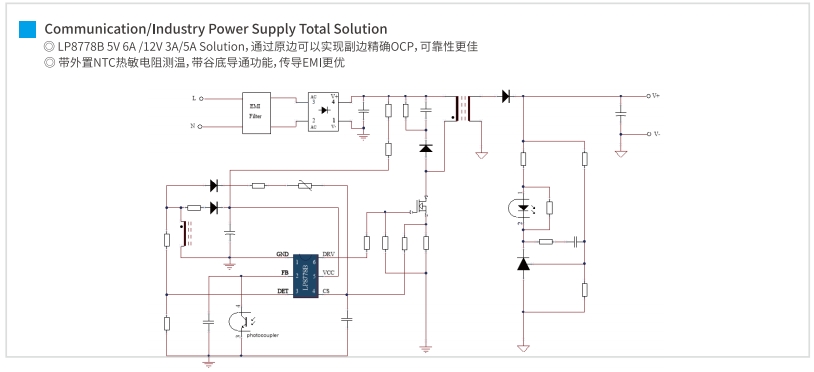 對于12W至24W的低功率應用,SSR MOS Combo提供了一種高效的解決方案。LP8728ML、LP8728MD和LP8728AD/BD系列PWM控制器,配合LP15R060SD SR控制器,能夠提供穩定的12V輸出,電流從1A到2A不等。這些組合特別適合于需要穩定低壓電源的通信設備。