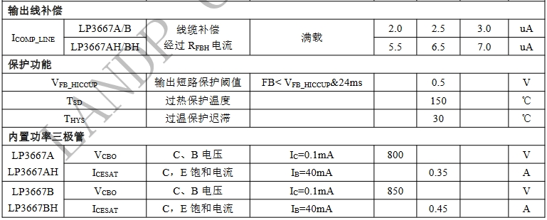 輸出線補(bǔ)償:LP3667BH具有6%的固定比例線纜補(bǔ)償,而LP3667B則為2%。這一差異可能會(huì)影響到輸出電壓的精確度和穩(wěn)定性,尤其是在長(zhǎng)距離傳輸中。