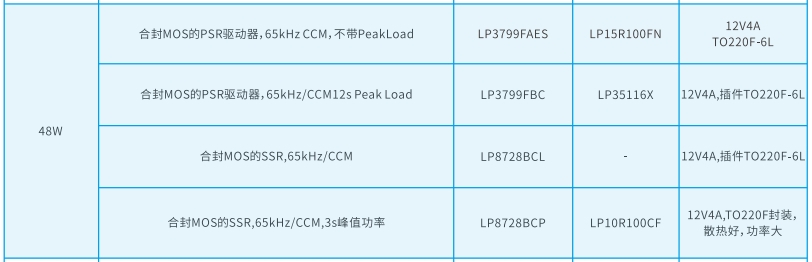 LP3799FBC:適用于65kHz/CCM的PSR驅動器,支持12秒峰值負載。與LP35116X配合,同樣提供12V4A的輸出。