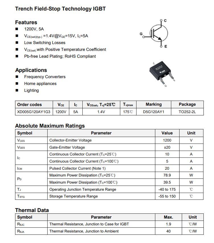 XD005G120AY1G3 國產(chǎn)IGBT 芯達(dá)茂 5A 1200V TO-252-3L