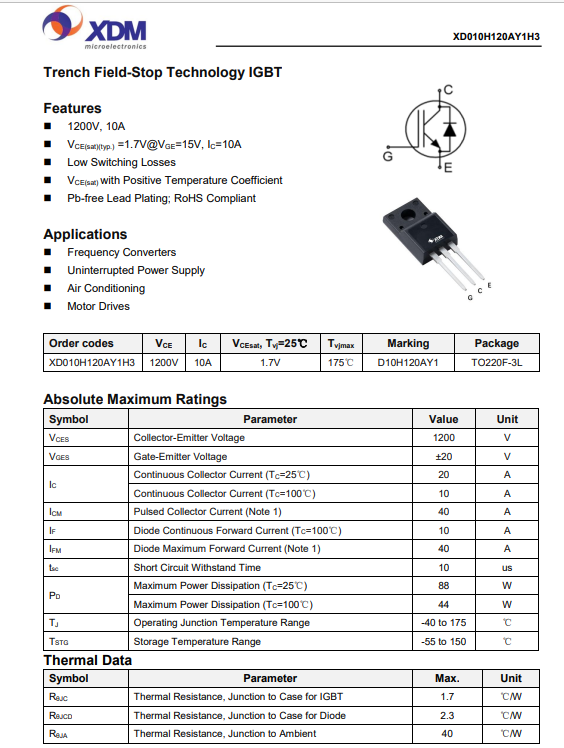 XD010H120AY1H3 國產(chǎn)IBGT 芯達(dá)茂 10A 1200V TO-220F-3L