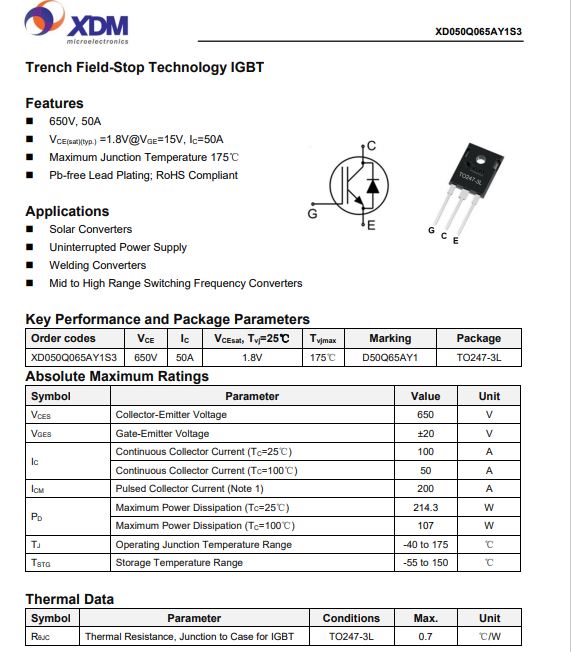 芯達(dá)茂XD050Q065AY1S3國產(chǎn)IBGT +FRD單管 50A 650V TO-247-3L