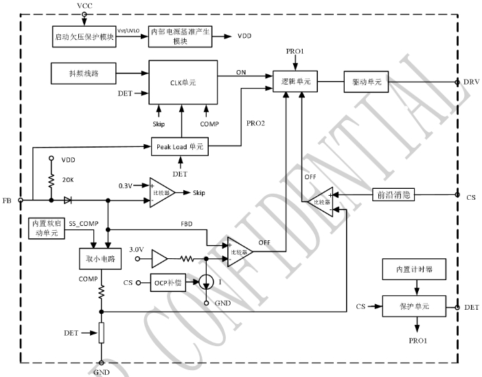 軟啟動功能:LP8776CD內(nèi)置典型值9mS的軟啟動功能,通過在啟動階段逐周期增加VCS保護閾值的方式實現(xiàn),有利于避免變壓器的飽和和降低副邊二極管的應力,從而提高耐壓性能。